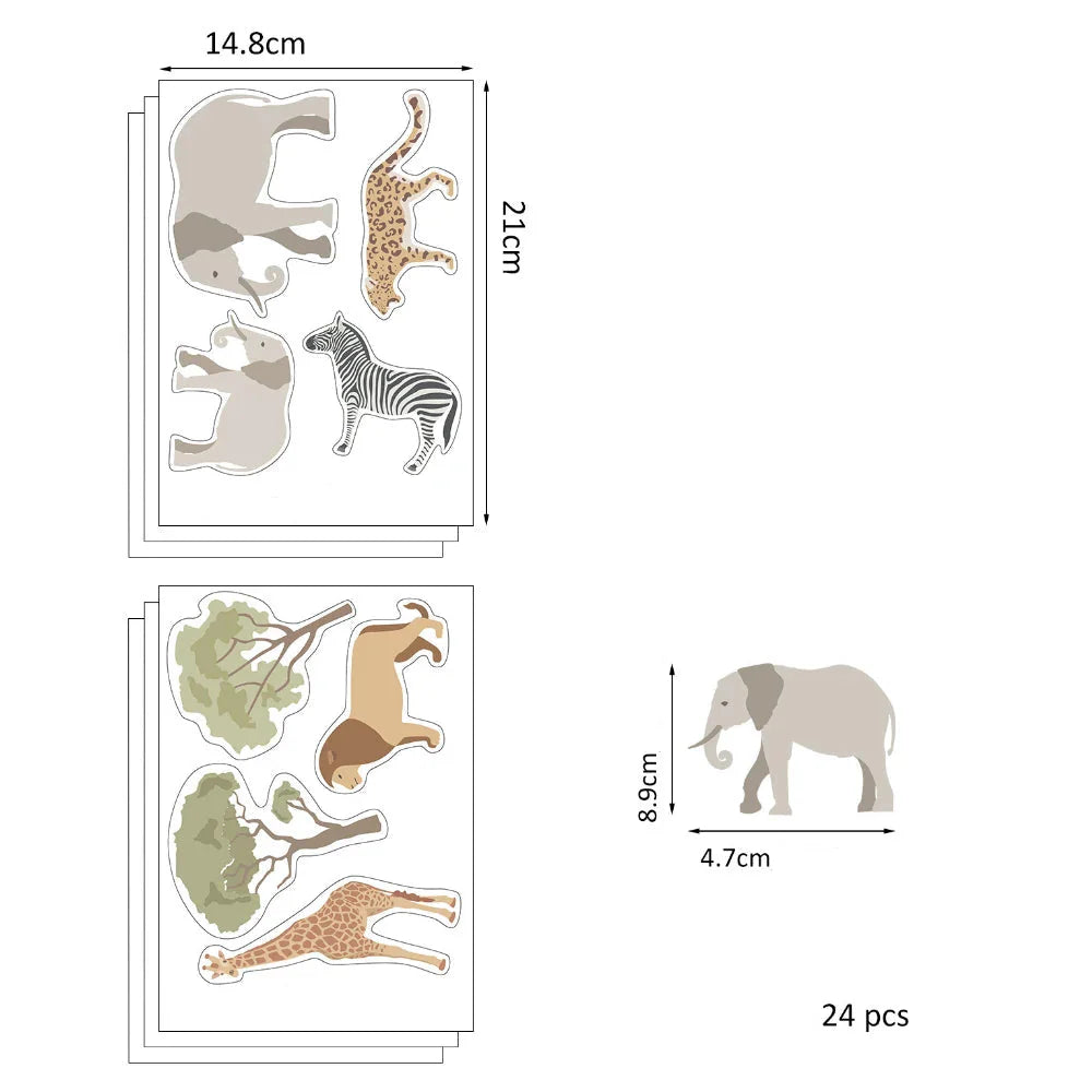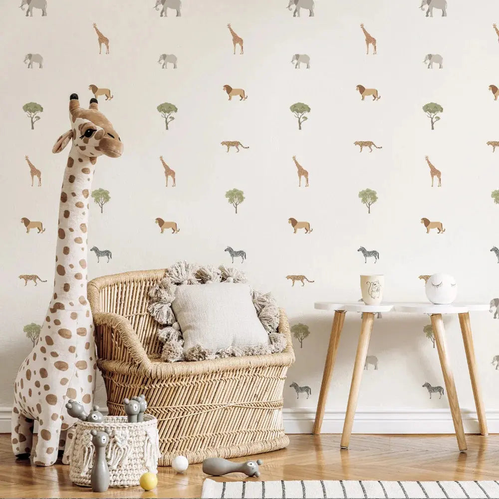 Adesivo de Parede Infantil Safari, transforme sua parede em uma savana africana com elefantes, leões e girafas. Fácil de aplicar e remover, sem danificar a parede. Faça sua decoração com um toque de aventura!