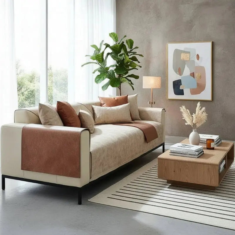 Capa de Sofá à Prova d'Água e Anti-Arranhão Premium Marrom: Confeccionada com frente em tecido de poliéster resistente à água e verso em fibra de poliéster ambiental com amido de látex antiderrapante.