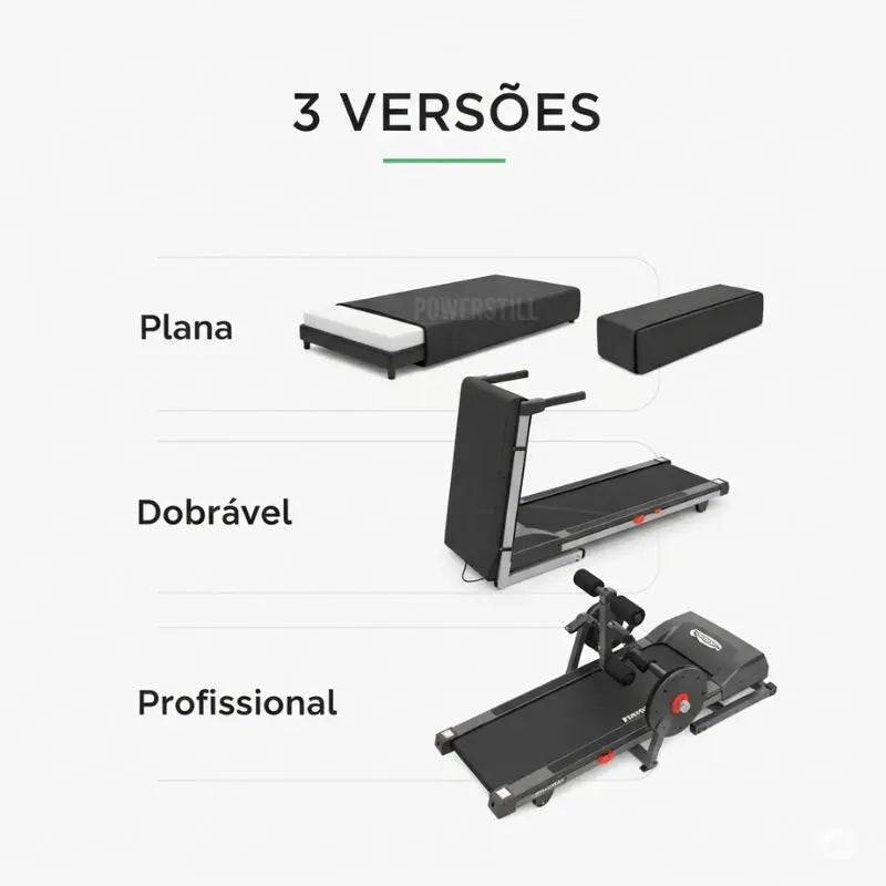 Se sua esteira não dobra e é usada em academias, escolha 'Profissional'. Se ela levanta a lona para economizar espaço, escolha 'Dobrável'. Para modelos slim de caminhada sem braços laterais, o modelo 'Plana' é o ideal. Verifique as dimensões do seu aparelho antes de finalizar.