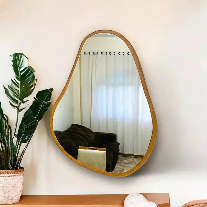Seu formato orgânico, combinado com bordas lapidadas e moldura em madeira, cria um efeito elegante e acolhedor que transforma a decoração.