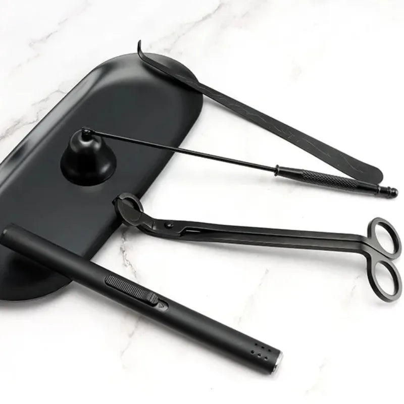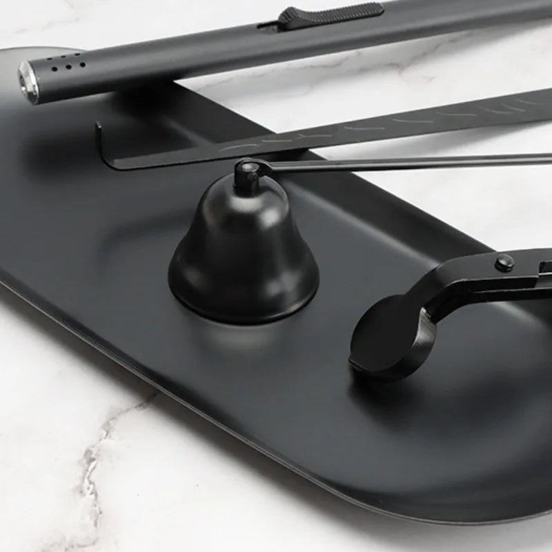 Composto por apagador, tesoura aparadora de pavio, gancho e bandeja, ele facilita o manuseio e prolonga a durabilidade das velas. O design em metal preto fosco harmoniza com qualquer decoração, trazendo um toque moderno e minimalista ao seu espaço. Mais do que acessórios, são ferramentas que preservam a beleza e o desempenho das suas velas aromáticas.