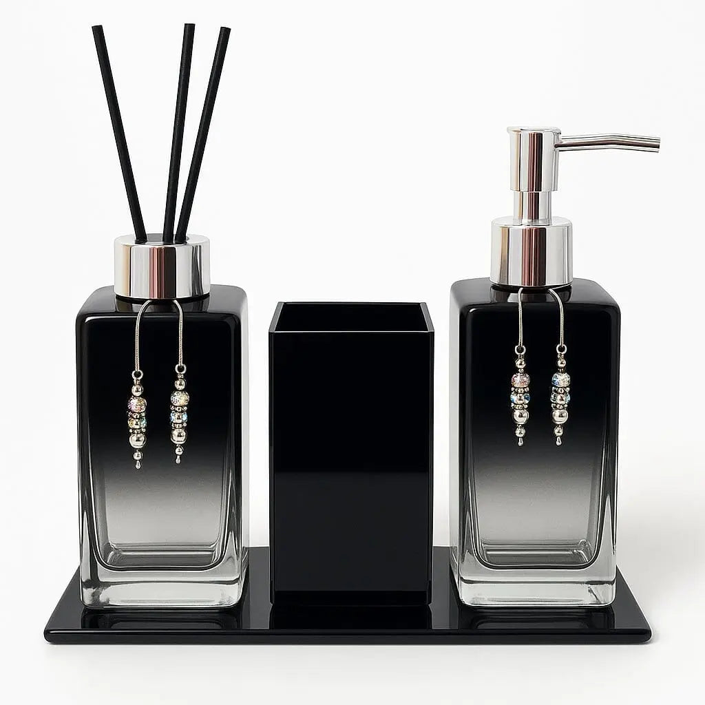 Este kit acompanha difusor de ambientes, frasco para sabonete líquido, porta escovas e bandeja de apoio. Tudo em vidro de alta qualidade, com design moderno que valoriza qualquer decoração.