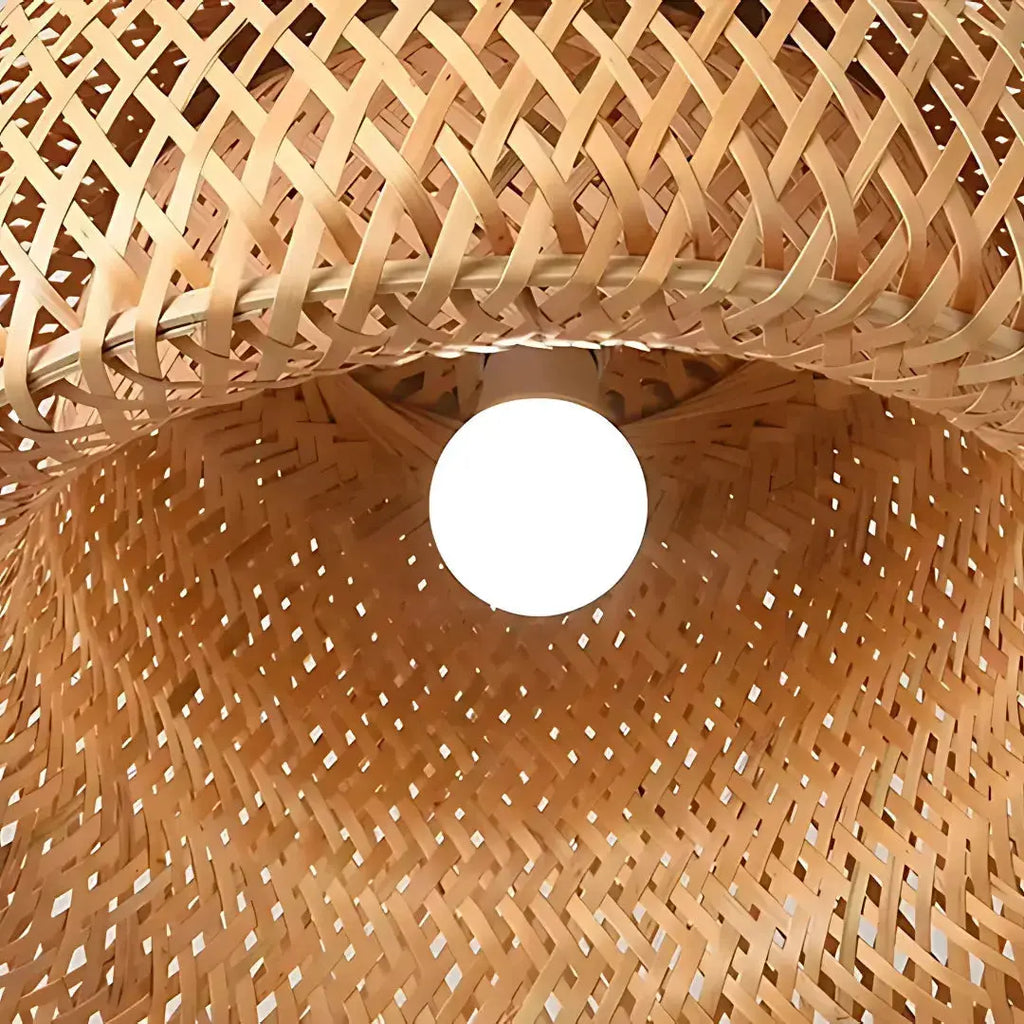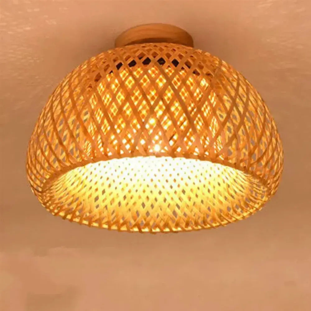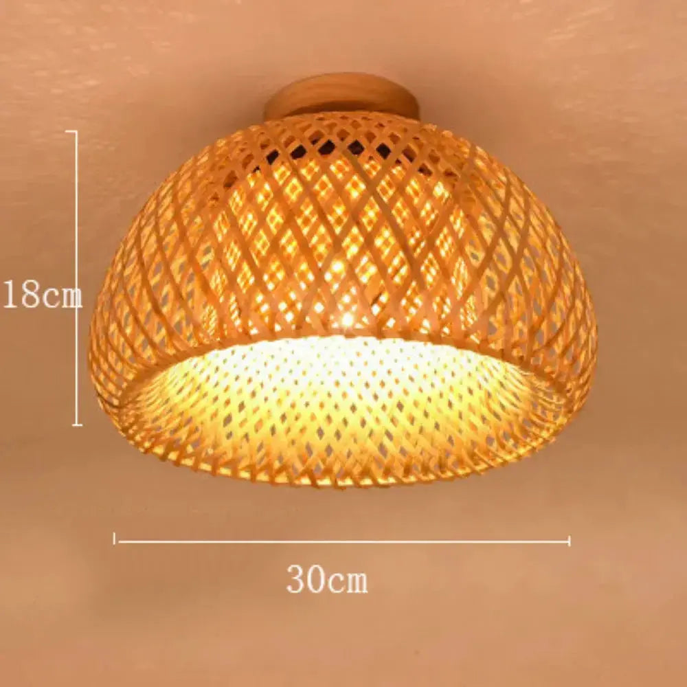 Feito com bambu natural, o plafon exibe uma estética única, com tramas artesanais que criam efeitos visuais encantadores quando iluminados. Seu acabamento detalhado traz personalidade a salas, quartos, varandas cobertas ou até vitrines comerciais.