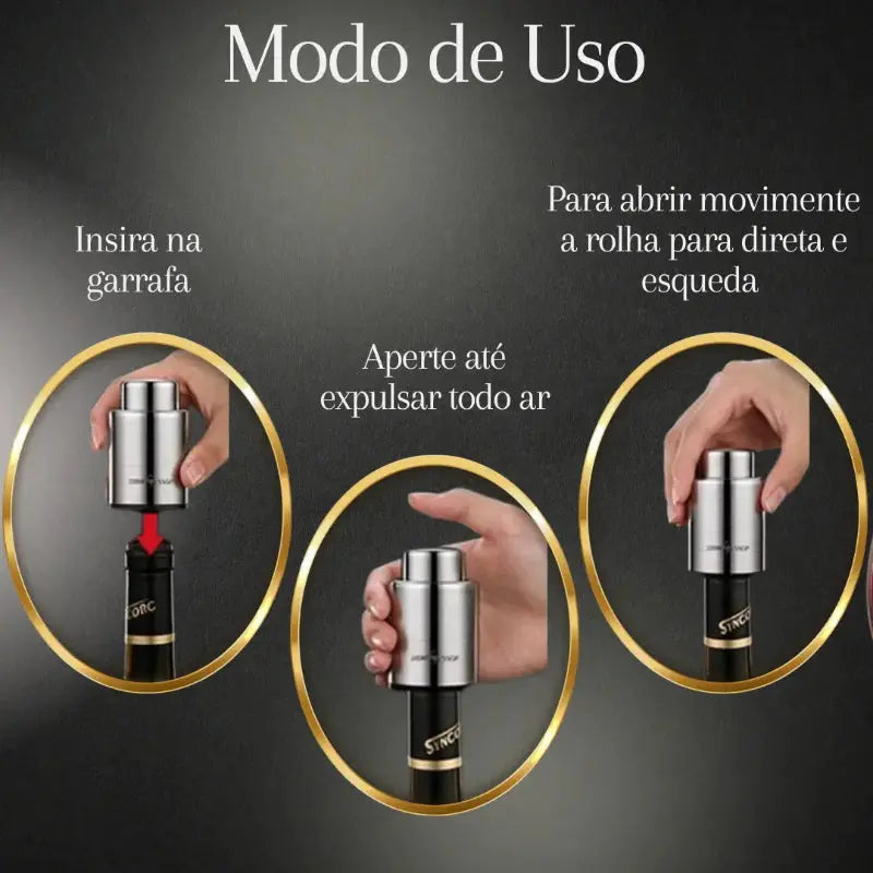 Este modelo é otimizado para vinhos tranquilos. Devido à pressão interna de gases em espumantes, recomendamos o uso de rolhas com travas mecânicas laterais para evitar que a pressão expulse o acessório.