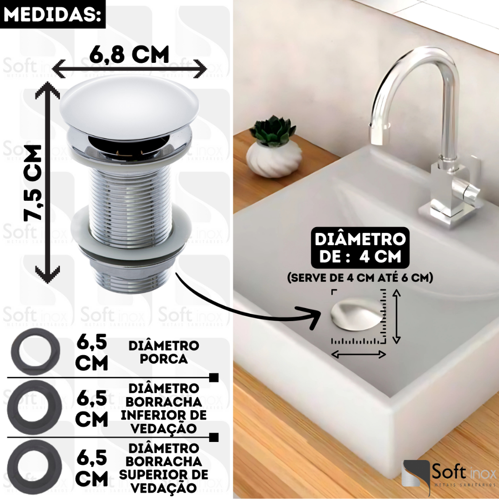 Ideal para cubas de vidro, porcelana, lavatórios e até tanques com furação entre 4 e 6 cm de diâmetro. Verifique a medida da sua pia para garantir o encaixe perfeito.
